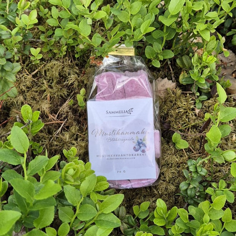 Mustikkavaahtokarkki Sammelia® Mustikanmaku on taianomainen kotimainen herkku, jossa yhdistyy aito Lapin mustikka ja pehmeä, suussasulava vaahtokarkki.