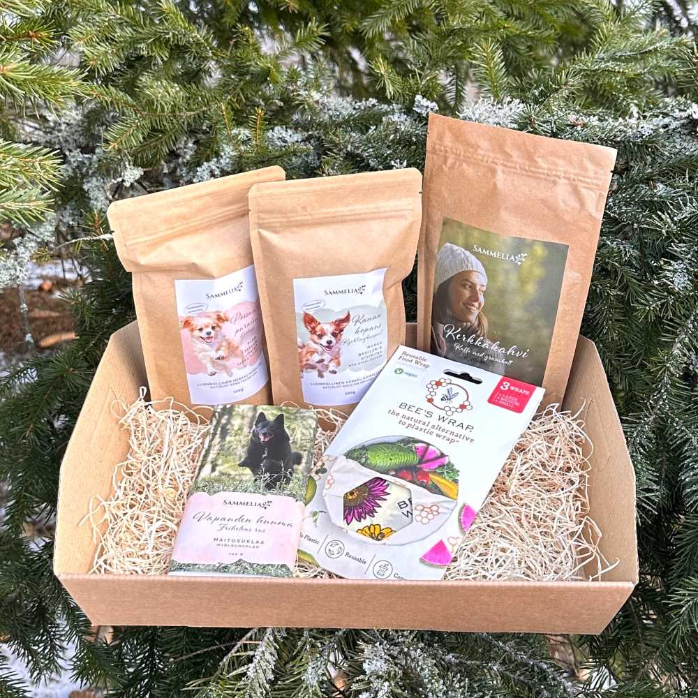 Mukana paketissa on myös pieni makumatka Sammallaakson Puodin retkieväsherkkujen maailmaan: Sammelian kerkkäkahvi ja suklaa sinulle sekä kotimaiset koiranherkut koirakaverille. Näin pääset kokeilemaan tuotteita käytännössä, vaikkapa yhteisellä metsälenkillä tai mökkireissulla.
